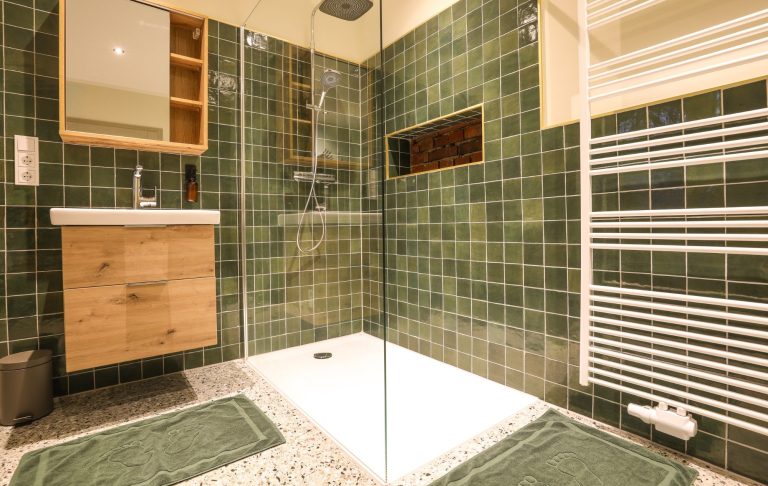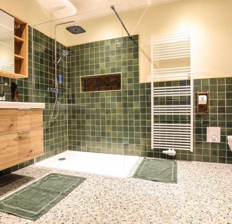 Bodengleiche Dusche mit Regenduschkopf und Handbrause