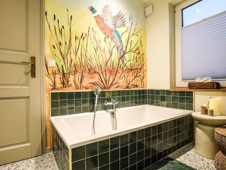 Modernes Bad mit bodengleicher Dusche (Regendusche und Handbrause), Badewanne, Waschbecken mit Spiegelschrank und Unterbau. Handtücher, Föhn und eine Sauna für bis zu 4 Personen stehen bereit. Für die Saunanutzung wird jeweils eine Gebühr von 20 EUR zzgl. USt. erhoben (für 2 Stunden, jede weitere Stunde 10 EUR zzgl. USt.). Diese wird nachträglich nach tatsächlicher Nutzung berechnet und ist nicht Gegenstand des Buchungsvorganges.