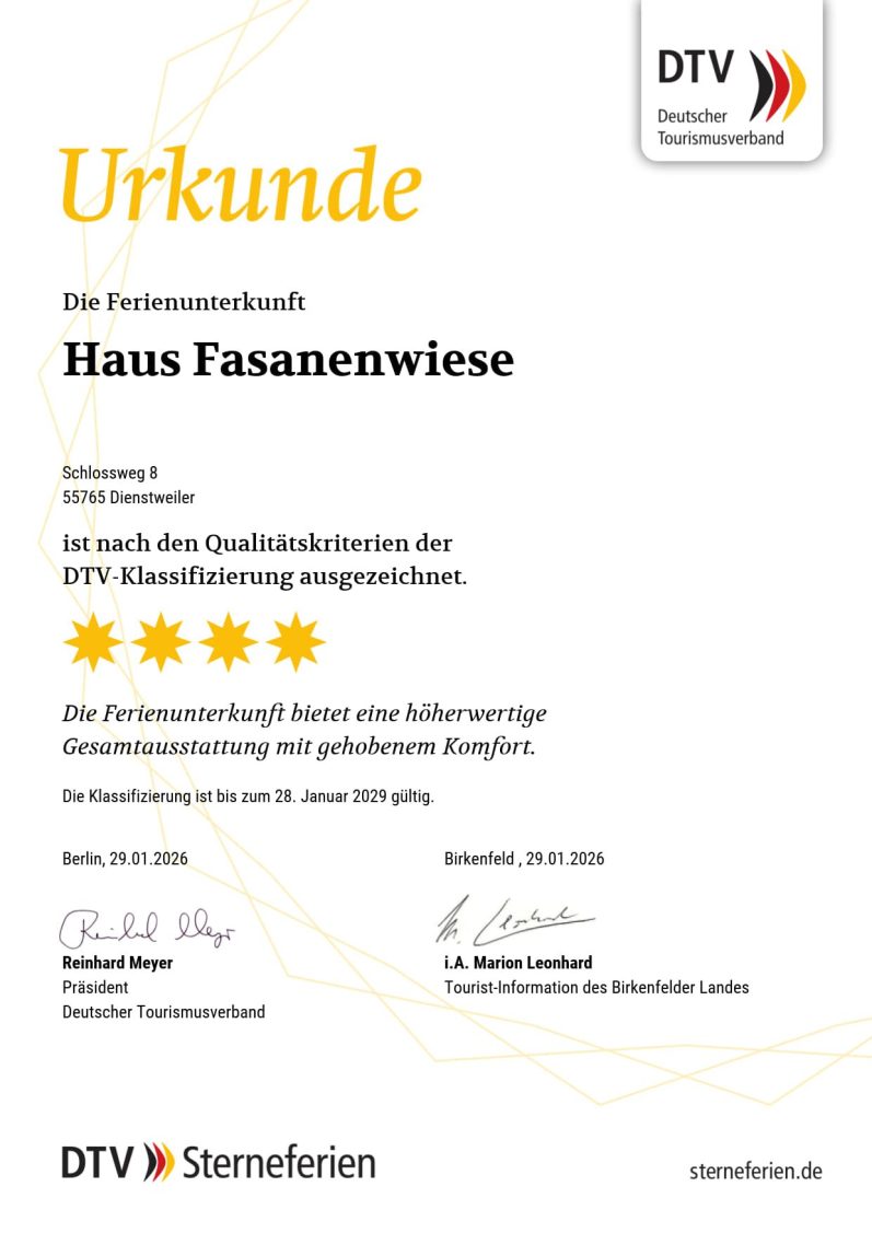 Aufgrund der Ortsrandlage können Wanderer und Radfahrer bequem direkt am Haus mit ihrer Tour beginnen. Bogensportbegeisterte finden in nur 1 km Entfernung den Einstieg ins Bogensportzentrum Eborn, Dienstweiler. Selbstverständlich können Sie den Tag aber auch ganz bequem im Haus und auf der großen Wiese verbringen und sich vom Alltagsstress erholen. Es erwartet Sie eine gemütliche und moderne Ausstattung. Die Unterkunft ist nach den Qualitätskriterien der DTV-Klassifizierung mit vier Sternen ausgezeichnet.