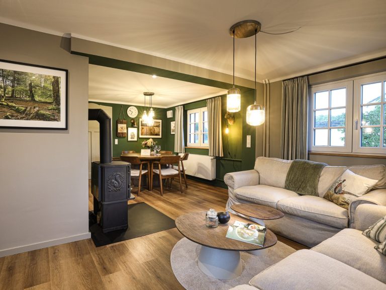 Helles, offenes Wohnzimmer mit gemütlicher 2er- und 3er-Couch, Kaminofen für kühle Tage und 55-Zoll-Smart-TV. Bücher- und Spieleregal sorgen für Unterhaltung. Der runde Esstisch bietet Platz für 6 Personen. Schnelles WLAN ist im ganzen Haus und Außenbereich kostenlos verfügbar. Kinderhochstuhl auf Wunsch verfügbar.